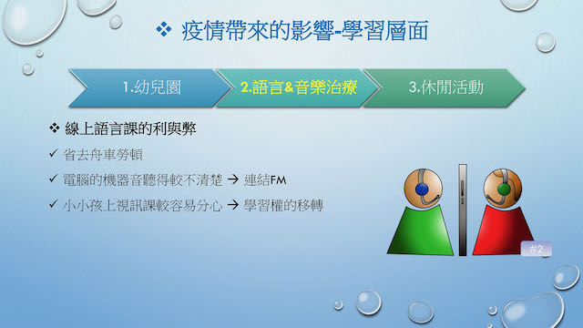 2021.07.15 【聽損家庭線上聚一聚 講師分享❣️】蒲公英聽語小幫手2021年7月15日讀畢需時 3 分鐘110/07/11 聽損家庭線上聚一聚,疫情下學前的聽損兒與家長看過來~ 週日下午本會舉辦了「聽損家庭線上聚一聚」活動。即使今年碰上疫情,本會仍繼續關懷聽損家庭,並帶給聽損家庭信心,繼續嘗試各種方式邀請大家相聚在一起。面對疫情,我們攜手共度,一起討論如何因應與面對。 活動上半場由韓國的圓圓媽媽(以下稱圓媽)分享。圓媽也跟我們分享圓圓的聽損狀況屬於內耳發育不全,所以在之後語言學習上,圓圓主要的學習為韓語。也很慶幸一路上遇到貴人帶領她和圓圓進入電子耳的新世界。自去年疫情爆發以來,在韓國的政策不斷變動而人人自危,家長焦慮於疫情的變動。由於圓圓是學齡前的聽損小孩,當圓媽開始居家上班之後,工作與育兒的狀況如何蠟燭兩頭燒,也真實反應疫情下家長的困境。之後圓媽也分享,韓國開始實施雙軌課程,提供學習包讓家長與孩子可以在透過親子實踐與遊戲中學習。在這過程圓媽也發現,其實讓孩子在家學習必須得「動靜皆宜」。同時也在生活中與孩子共同觀察細微的變化,並記錄下來。與孩子建立日常規範。 圓圓個性內向,圓媽也分享如何學習與內向的孩子溝通。因為疫情圓媽也開始擔心圓圓的人際關係,漸漸地,圓媽也克服自己的心態問題,願意放手給孩子時間並嘗試不同種陪伴方法,圓媽也分享,在韓國前陣子疫情稍微趨緩的時候,圓媽也嘗試帶圓圓參與兒童劇的活動,讓圓媽更感動的是,老師會帶透明的口罩並且會將FM輪流交換給主講人讓聽損孩子可以聽得更好。我們也期待台灣後續能夠參考這樣貼心的服務。 語言學習上,由於圓媽和圓圓是一起學韓語,常常圓圓媽媽會很擔心自己是否無法做好中間的角色,也曾有這樣的焦慮。後來在語言老師的引導下,圓圓媽媽也逐漸了解,不需時時充當孩子的翻譯。「告知」這件事很重要,在視訊課程前要告訴孩子學習是自己的事,若有不會就要主動問老師,身為家長也不要因為過於想讓孩子學習更快,而間接剝奪孩子學習的權利。適度地將學習權移轉是非常重要的事。 最後,圓媽也針對疫情下如何面對孩子的情緒問題,並提供幾個建議,除了以身作則,也鼓勵家長與孩子練習如何將「情緒具體化」,並一起學習「愛的語言」。分別為 1.鼓勵的話:表達正向且充滿愛的話語。 2.精心時刻:空出時間,專心陪孩子。 3.接受禮物:接受孩子給你的愛並持續陪伴 4.服務的行動:思考別人為你做什麼事情你感受到愛,並付諸行動。 5.身體接觸:擁抱跟親吻是不錯的選擇 我們可以觀察什麼是屬於孩子愛的語言,也可以找到自己與另一伴之間的愛的語言。 但在愛孩子之前,圓媽也鼓勵照顧者們,要先學會如何愛自己。提醒家長在為孩子付出時別忘了自己的感受,建立屬於自己的時間,增加效能感。要照顧好自己,才有辦法照顧身邊的家人,疫情期間,我們可以學習先從個人層次開始再關心家人再到更高層次的付出,想想可以為別人做些甚麼。在育兒辛苦的過程中釋放負面能量。疫情終將會過去,也希望我們可以更加勇敢面對生活。