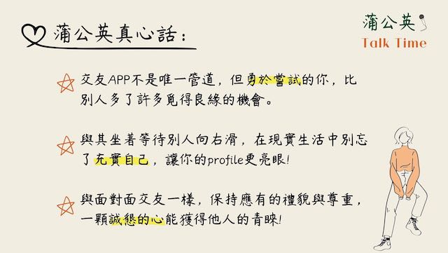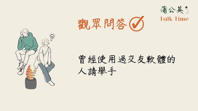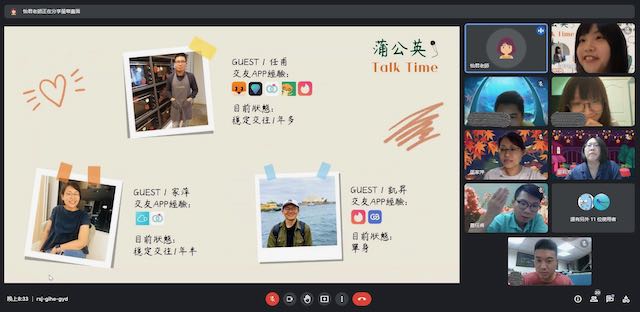 2022.08.03 歡迎收看「蒲公英Talk Time」蒲公英聽語小幫手2022年8月3日讀畢需時 1 分鐘兩年來的疫情讓我們失去很多,卻也使我們發想出更多元的服務型態。111/07/29晚上播出第一集「APP裡的愛情」,邀請三位年輕的聽損朋友擔任嘉賓,與我們一同暢聊交友APP的使用經驗,並由與聽損朋友熟識的怡君老師擔綱主持,在與來賓一來一往的微妙互動中,勾勒出大家心中嚮往的愛情模樣,原來交友APP真的可以找到真愛觀眾朋友們期待更多有趣的主題嗎?蒲公英Talk Time與你相約每個週末夜#蒲公英線上談話性節目 #口碑場大成功 #已經有觀眾們敲碗續集了