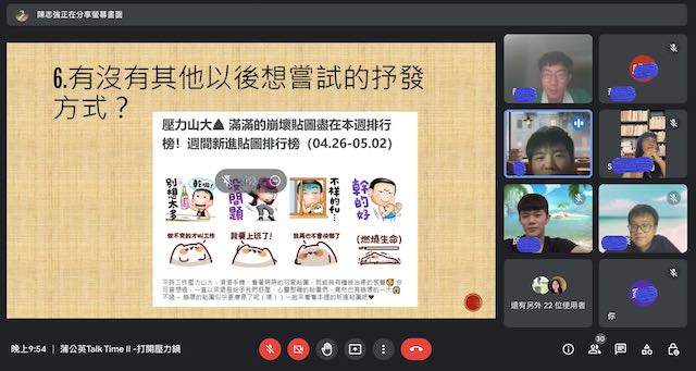 2022.10.18 【蒲公英 Talk Time - 打開壓力鍋】蒲公英聽語小幫手2022年10月18日讀畢需時 1 分鐘已更新:2022年10月20日蒲公英 Talk Time第二集敲碗上線~本集節目邀請到聽損社青 - 陳志強擔任主持人,師大特教研究所畢業的他熱衷觀看及從事棒球比賽,也還是一位專欄作家,這次邀請三位來賓好朋友一同探討對壓力的看法、認識跟如何和壓力共處。在日常生活中遇到家庭、工作、課業、人際關係…等等,總是會遇到一些壓力,無法解決的難題除了要尋求專業人士引導或諮詢,該如何轉換心態把壓力轉為前進的能量,都是每人會面臨的課題,而這些經歷都會變成自身經驗值及成長值。主持人與來賓們在輕鬆的週五晚上各自分享遇到壓力的經驗、該如何面對壓力及抒壓的方式…等,言談之間透露出彼此之間的好默契也為節目帶來歡笑,甚至引起聽損聽眾朋友們在台下有熱烈回應及不吝分享自己的經驗。聽損朋友擔心聽不到時產生的壓力,如剪髮時得拿掉輔具;擔心聽不清楚時產生的壓力,台上的講者會不會突然點到我;擔心聽力變化的壓力、、、,這些是聽損朋友的生活,也學習如何排解這些壓力源。#蒲公英線上談話性節目 #第二場大成功 #已經有觀眾們敲碗下集了