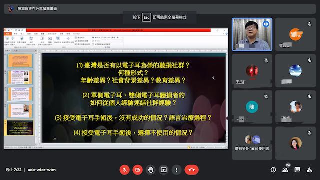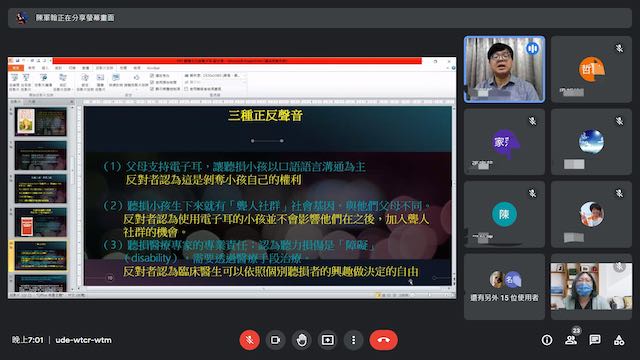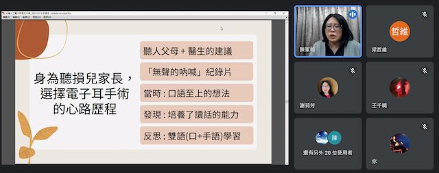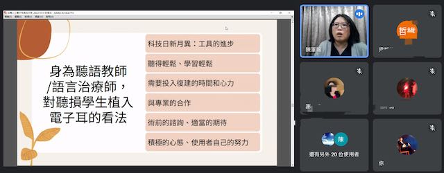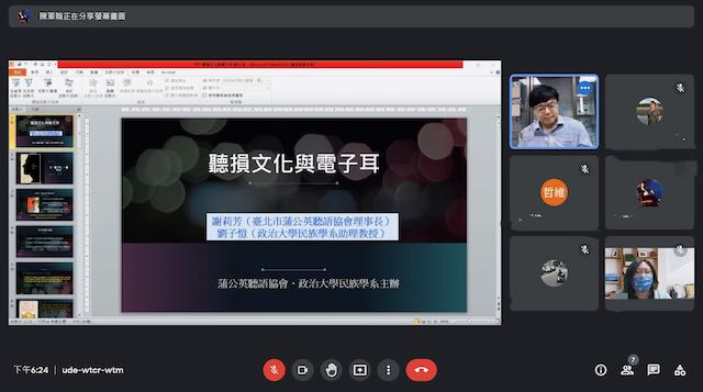2022.10.27 【障礙人類學 - 聽損文化與電子耳】蒲公英聽語小幫手2022年10月27日讀畢需時 1 分鐘已更新:2022年11月16日111/10/19 本會謝莉芳理事長與政大民族學系劉子愷助理教授共同主持線上、實體【聽障文化與電子耳】講座,吸引不少聽人及聽損朋友一同參與。劉教授透過Blume, Stuart所寫「The Artificial Ear」一書進行導讀,探討電子耳帶來的正反聲音及社群文化,劉教授是語言文化人類學家,就其角度提出一些觀察和見解,謝理事長則分享台灣電子耳現況及電子耳術後語言治療的重要性…等等,另外也邀請二位聽損朋友分享聽損歷程、社交生活,現身說法。講座中也有幾位參與者分享了對於使用電子耳的看法、與疫情之下的困境等,在聽損文化裡面不同面向的分享,也讓參與活動的聽人朋友們對聽損族群有了更多的認識。#障礙人類學 #政大民族學系 #聽損文化與電子耳